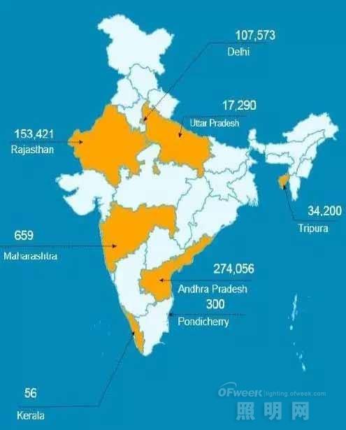 3、印度国家路灯计划(SLNP),计划替换900万盏路灯,预计年节电24亿千瓦时。截止到2016年1月28日,共完成了588726盏传统路灯改造替换,其中平均每支路灯每天节能0.363千瓦时,每天总节电21万千瓦时。