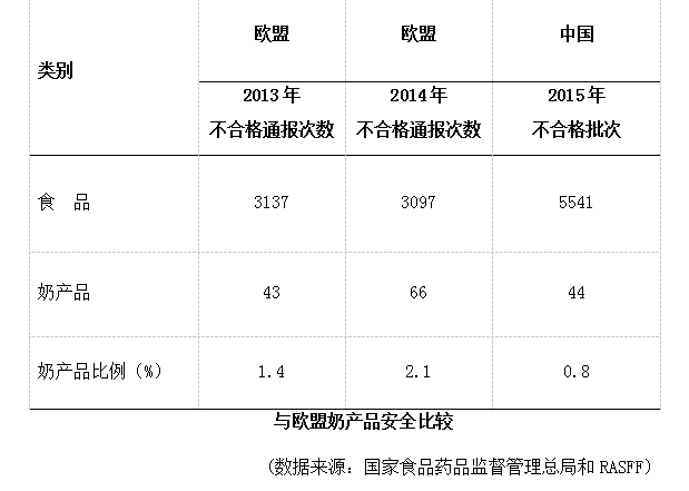 欧盟官方的食品与饲料快速预警系统(RASFF)2013年年度报告中,食品不合格通报3137起,其中奶产品相关43起,占1.4%;2014年年度报告中,食品不合格通报3097起,其中奶产品相关66起,占2.1%。2015年,国家食品药品监督管理总局发布报告显示,我国不合格食品5541批次,其中不合格奶产品44批次,不合格奶产品仅占不合格食品的0.8%。
