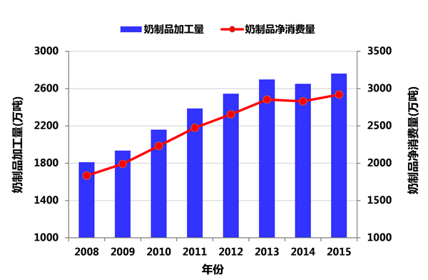 2008~2015年我国奶制品加工量和净消费量