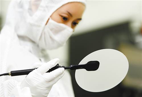 近日,重庆四联光电科技有限公司工作人员正在对大尺寸蓝宝石衬底进行检测。