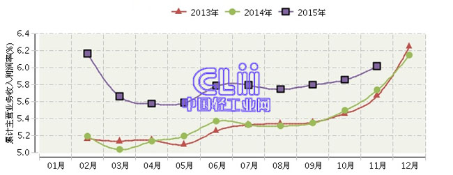 2015年1~11月全国家具行业累计主营业务收入利润率为6.02%