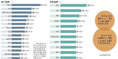 在地域分布上,陕西和黑龙江无论在生产企业和配方注册数量上均领先于其他地区。据新京报记者不完全统计,陕西省约有20家工厂55个品牌165个配方通过注册。而在黑龙江地区,约有29家工厂82个品牌的243个配方通过注册。