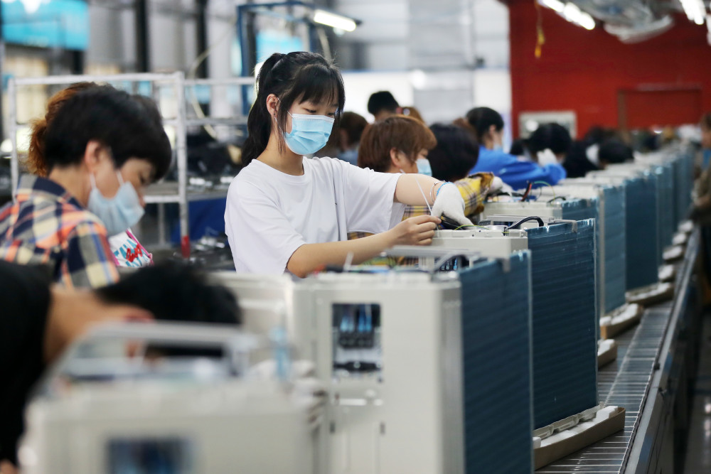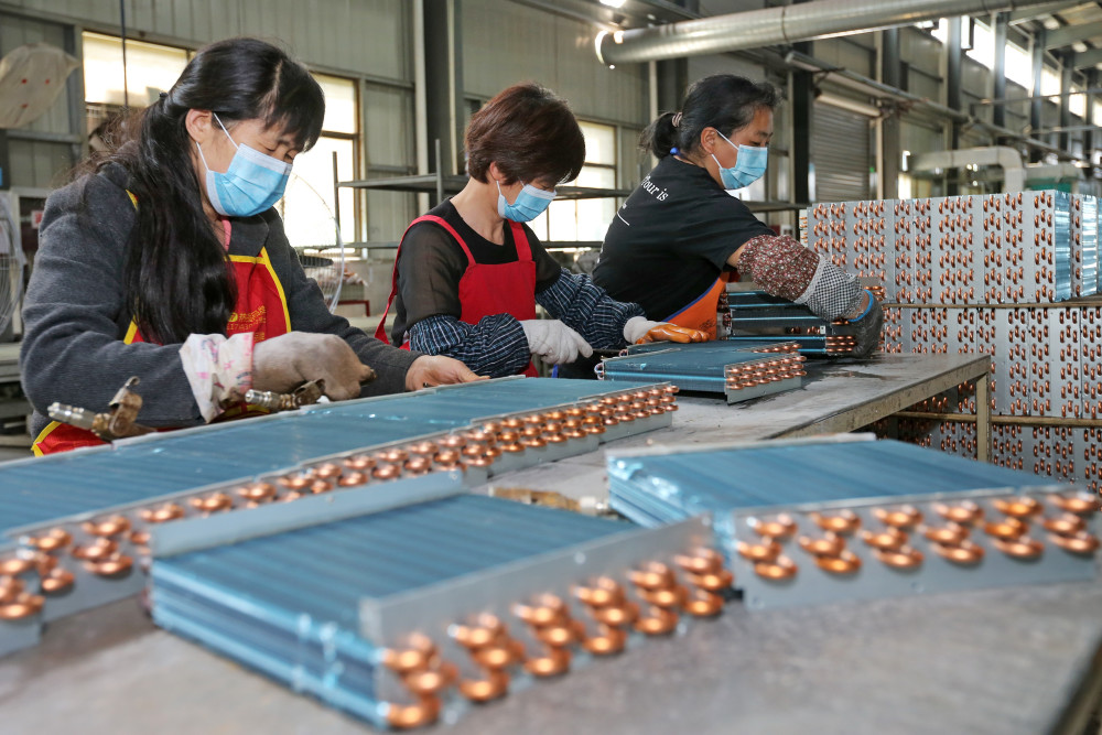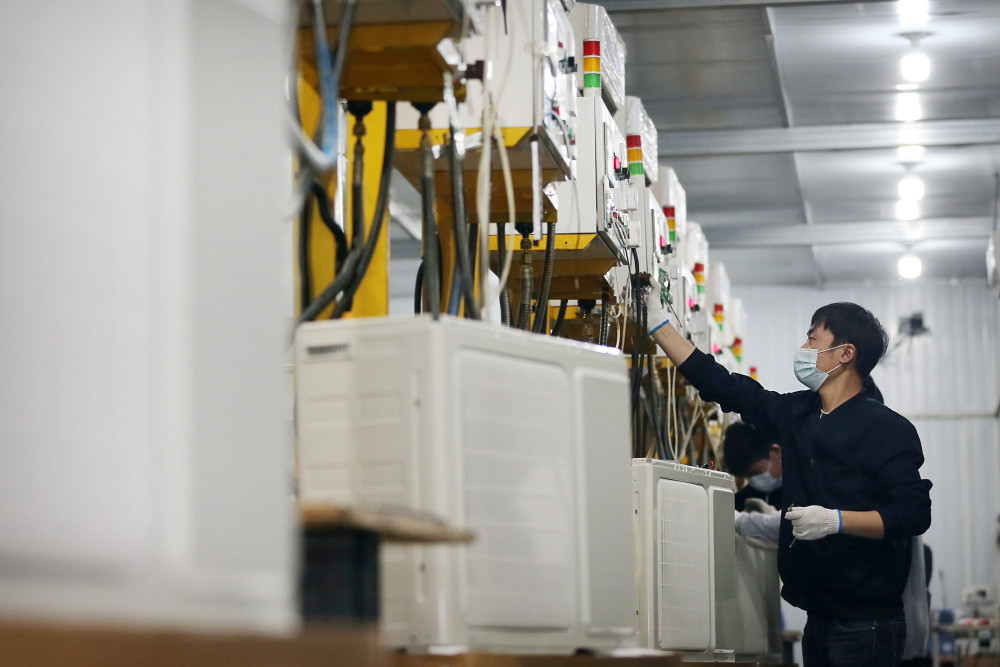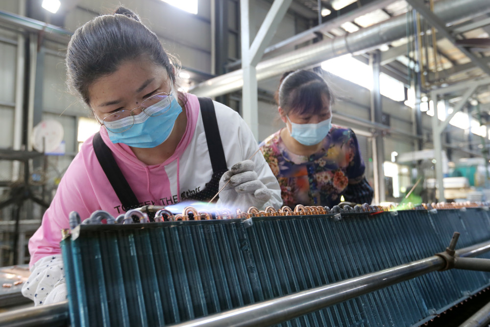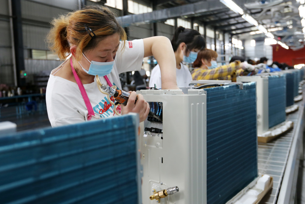 5月18日,工人在淮北市濉溪经济开发区一家空调企业车间内忙碌。 新华社发(万善朝 摄)