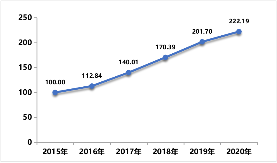 产业实力指数呈现显著增强态势,2020年达到最高点212.40点。企业数量持续增多;产业规模和产业投入稳步增长;产业效益大幅提升,增幅远超产业规模。