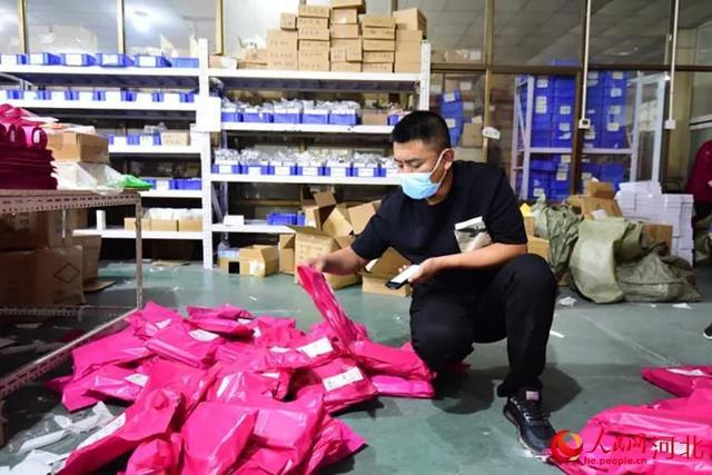 河北青县一家化妆刷电商企业库房内,员工为快递张贴面单。 张鹏摄