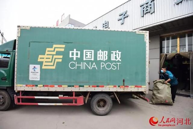 河北青县一家化妆刷电商企业厂房外,邮政公司揽收快递,将发往全国各地。 张鹏摄