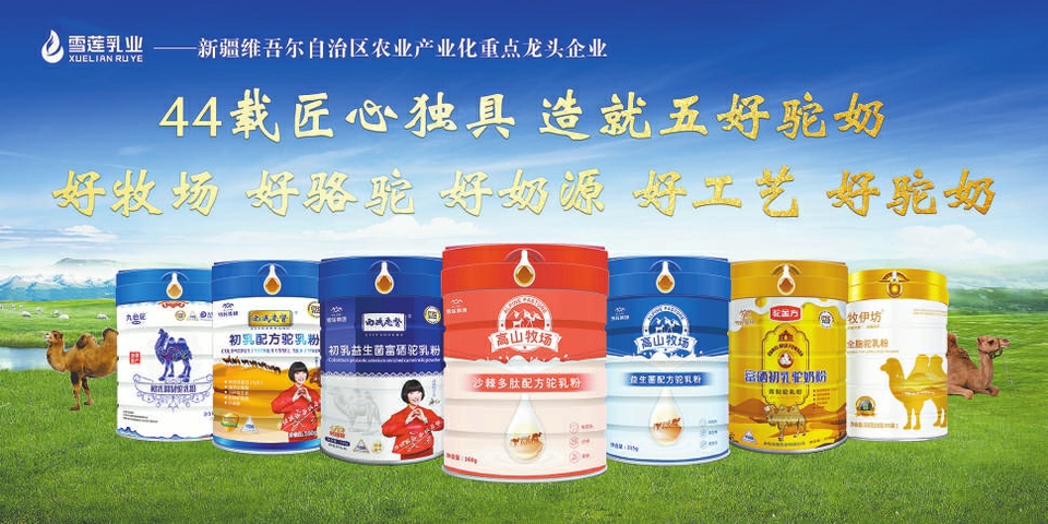 雪莲乳业现拥有高山牧场、西域总督、驼金方、牧伊坊、瀚舟、九色驼、驼牧尔等品牌驼乳粉,以过硬的产品质量促进了新疆驼奶的大力发展。作为一家有责任的企业,诚心实意带领牧民走致富之路,以“守初心筑匠心、做消费者放心的百年乳品企业”为愿景,以“让国民喝上健康放心骆驼乳”为使命,遵循“五好驼奶”理念,为中国驼乳产业的健康发展扛起一面大旗,为中国乳业实现现代化高质量可持续发展,更为边疆的乡村振兴,实现共同富裕贡献一份力量!