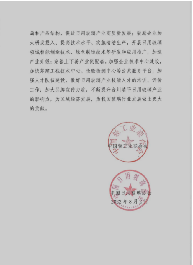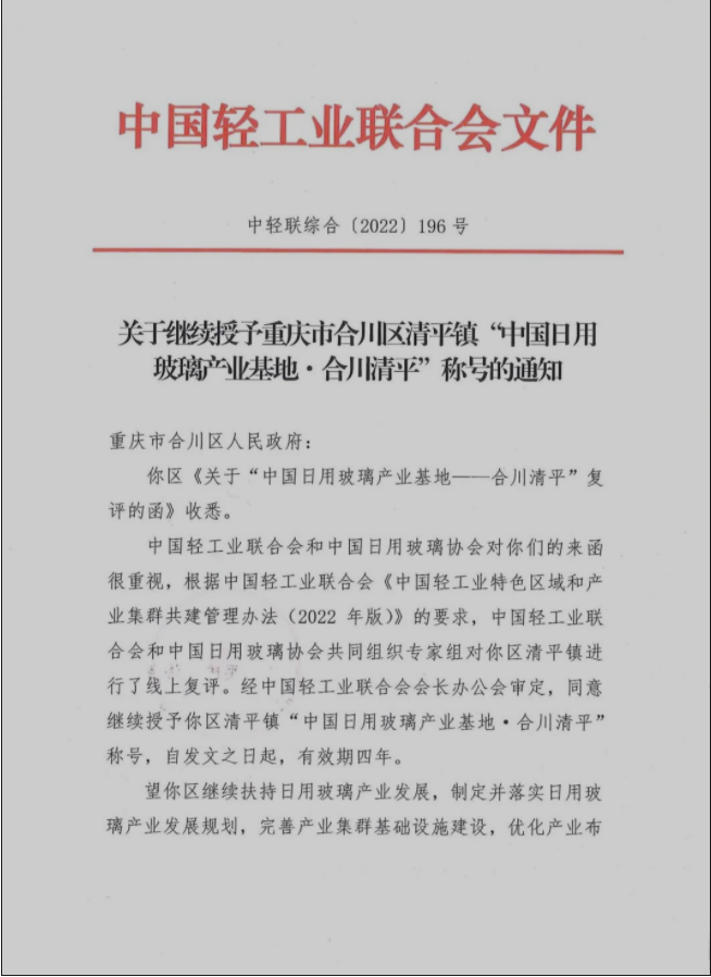 和中国日用玻璃协会共同授予“中国日用玻璃产业基地·合川清平”称号。2022年6月,经重庆市合川区人民政府申请,由