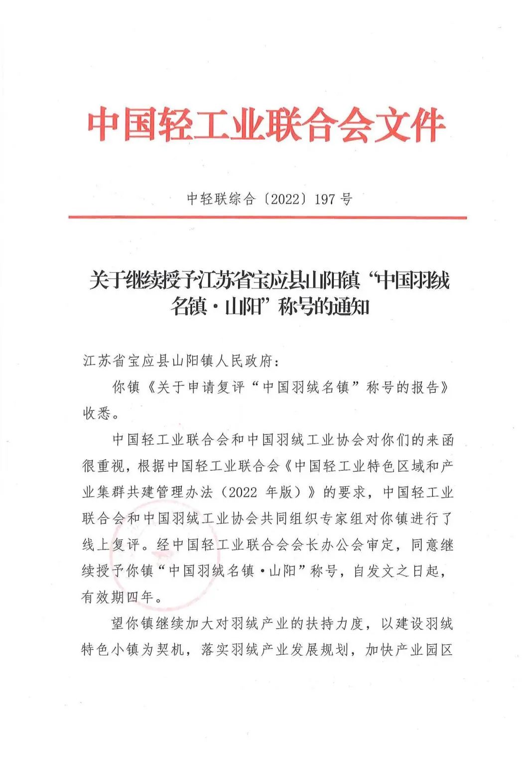 和中国羽绒工业协会共同授予“中国羽绒名镇·山阳”称号。2022年6月,经宝应县山阳镇人民政府申请,由