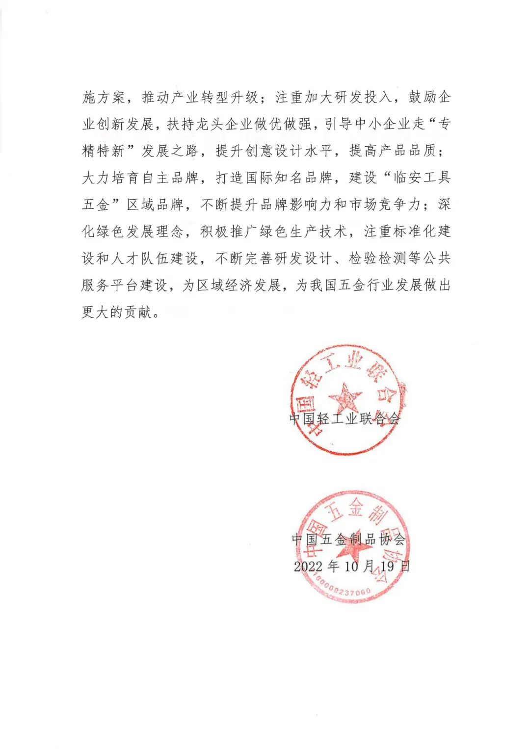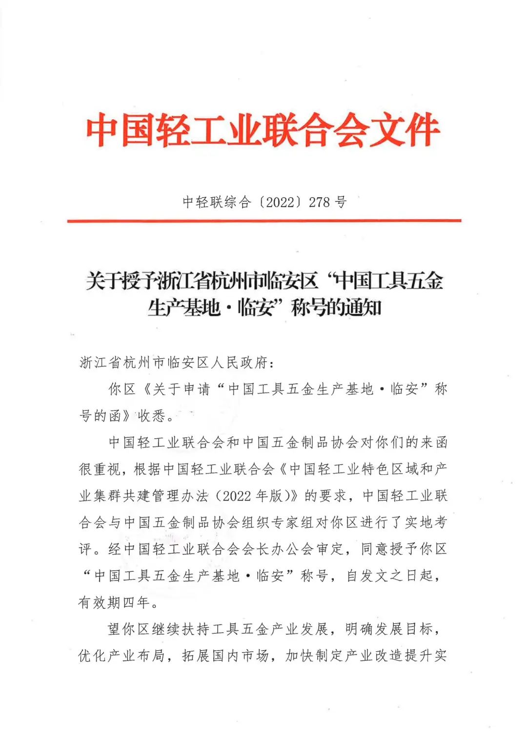 临安区是浙江省杭州市辖区,位于杭州市西部。工具五金产业是临安区特色产业。2022年10月,经杭州市临安区人民政府申请,由 和中国五金制品协会组织专家组实地考评,并经 会长办公会审定,同意授予杭州市临安区“中国工具五金生产基地·临安”称号。