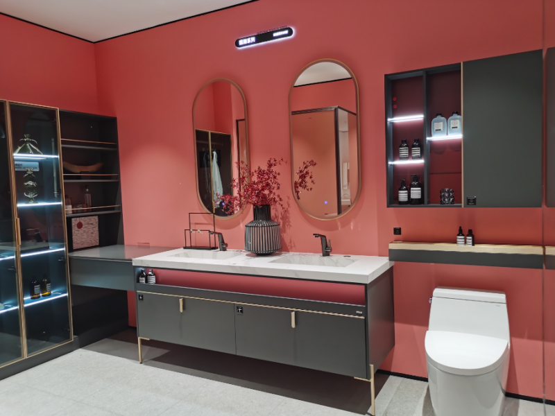 除了智能坐便器,此次走访的企业还持续进行其他卫浴产品的迭代创新。尤其是浴室柜的电气化升级,已经从浴室镜延伸至整个浴室柜。两年前走访佛山卫浴企业时,浴室柜的电气化主要体现在浴室镜上,包括一键除雾和智能灯光等。而此次走访中,浴室柜的电气化发展体现在各个方面。例如,浴室镜新增大屏幕,内置天猫精灵系统,既可以在洗漱时通过大屏幕观看视频,也可以控制整个智能浴室场景;浴室柜增加变温柜,可以存放对存储条件有一定要求的化妆品;将浴室镜后的柜体更改外升降式,拿取物品更方便且不影响浴室镜的试用体验。