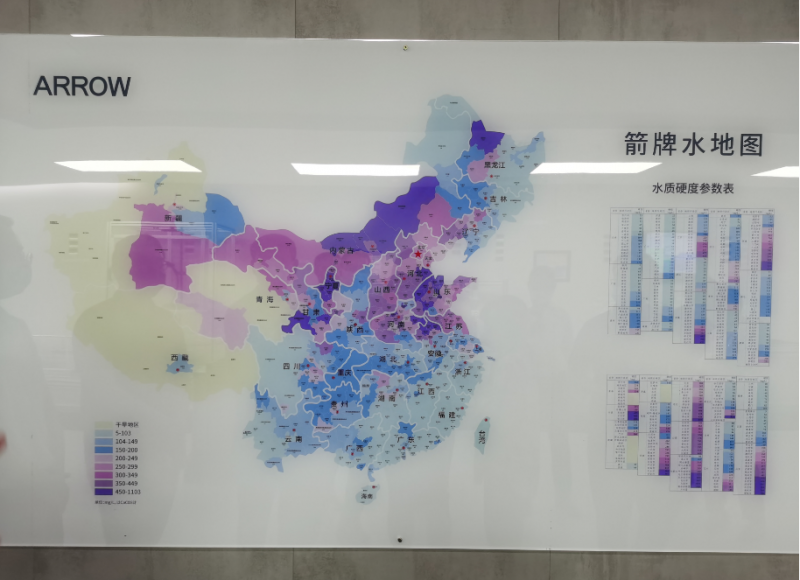相比两年前,《电器》记者在箭牌看到了不少新增的性能研究区,例如智能坐便器盖板开合性能研究区、浴室家具人体工程体验区、智能坐便器综合性能测试区、坐便器座圈和盖力学测试区、仿真热源与恒温花洒研究区、热源测试区、水质研究区等。其中,水质研究区处的一幅水地图令人印象深刻。据箭牌有关负责人介绍,箭牌从不同城市运回了水,用不同城市的水对智能坐便器进行性能测试。在对各地水质进行检测后,制作了箭牌水地图,标注了各地水质的硬度。