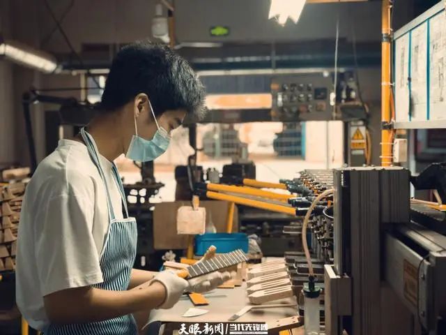 正安县中等职业学校实习生正在制作吉他“学校里学到的知识能用上,在这里实习还有新收获,老师傅们都很耐心地教我操作方法。今年我有机会去公司总部学习,希望自己在这个行业能获得更好的发展机会。”正安县中等职业学校乐器维修与制作专业毕业的学生旺正豪已经在钰丰乐器实习了一个多月。
