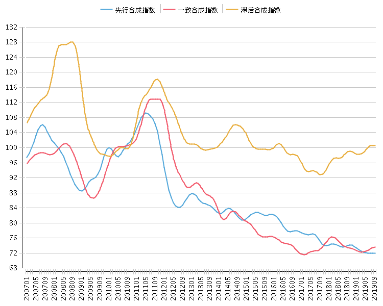 中国轻工业消费品景气指数显示,09月, 一致合成指数为73.67点(2010年=100), 比上月上升0.19点; 先行合成指数为71.97点(2010年=100), 比上月上升0.03点; 滞后合成指数为100.59点(2010年=100), 比上月下降0.05点。