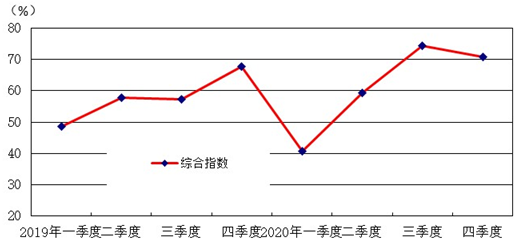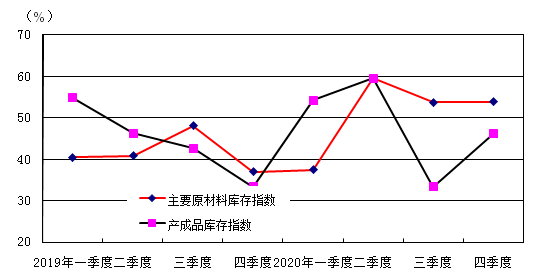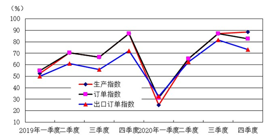 2020年四季度,生产指数为88.5,环比三季度上升1.4个百分点,同比上年四季度指数上升1.5个百分点。销售订单指数为82.7,环比三季度下降4.3个百分点,同比上年四季度下降4.3个百分点;其中出口订单指数为73.1,环比三季度下降8.4个百分点,同比2019年四季度微增0.9个百分点。四季度,生产指数和订单指数(包括出口订单指数)仍然处于增长区间,但订单指数和出口订单指数回落,表明市场销售增速下降。