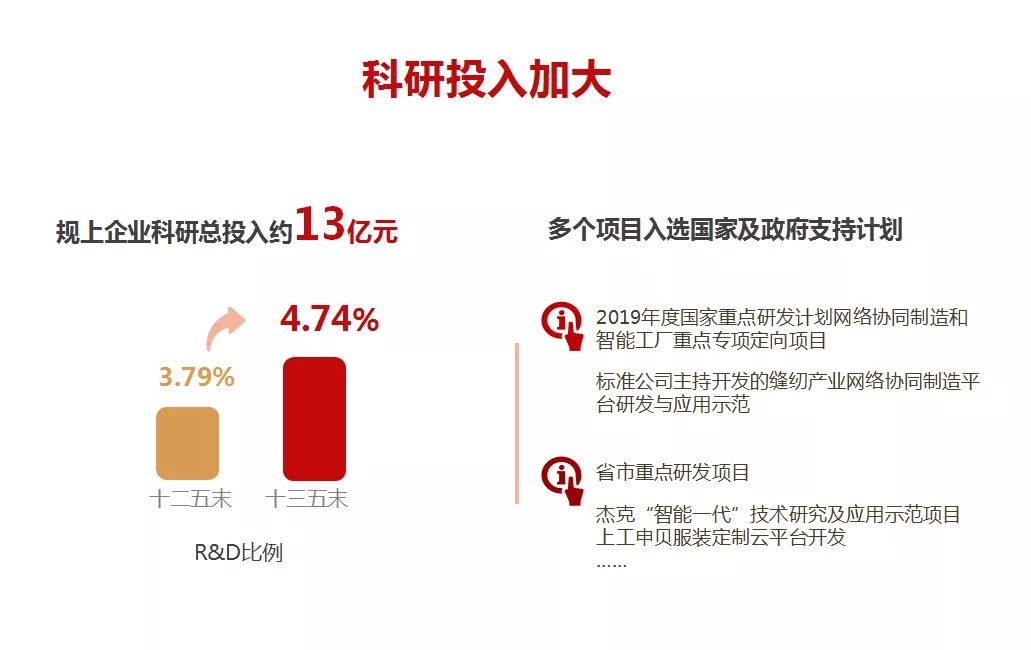 ——科研投入持续加大。“十三五”期间,行业规上企业科研总投入约13亿元,R&D比例由“十二五”的约3.79%提升至约4.74%;多个项目入选国家及地方政府支持计划,由标准公司主持开发的缝纫产业网络协同制造平台研发与应用示范被列入2019年度国家重点研发计划网络协同制造和智能工厂重点专项定向项目,杰克“智能一代”技术研究及应用示范项目、上工申贝服装定制云平台开发等项目入选相应省市重点研发项目。