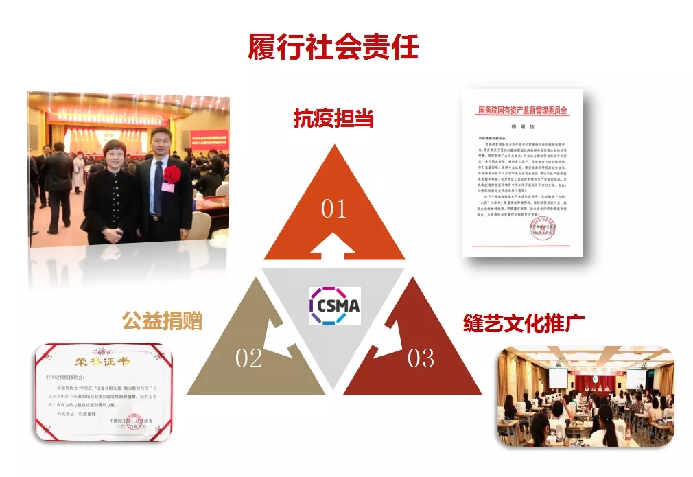 新冠疫情爆发以来,协会团结广大缝制机械企业,排除万难,有效的保障了防护服贴条机、口罩机等防疫设备供给;多措并举,有序推进行业复工复产;同时还通过组织企业捐款、捐物数百万元,免征全体会员年会费近百万元等形式,积极承担社会责任,获得了国家和社会的一致肯定,协会及协会相关负责人分别荣获国资委党委、 党委等上级部门的表彰。