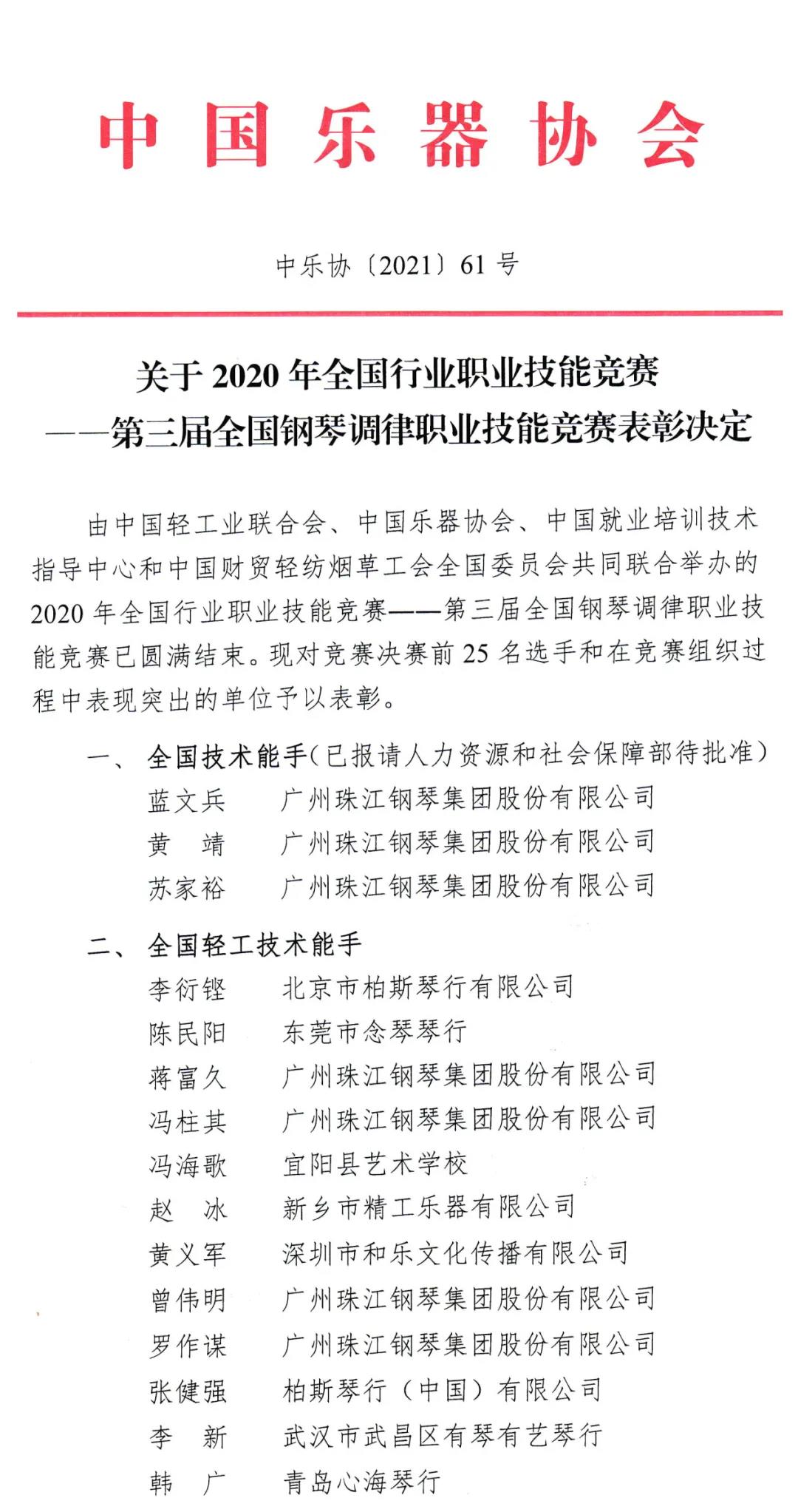 关于2020年全国行业职业技能竞赛——第三届全国钢琴调律职业技能竞赛表彰决定