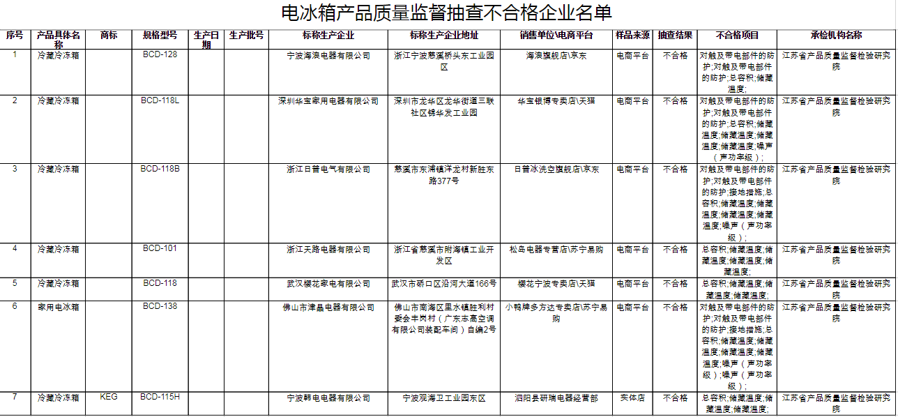 江苏省市场监管局抽查47批次电冰箱产品 不合格率为15%