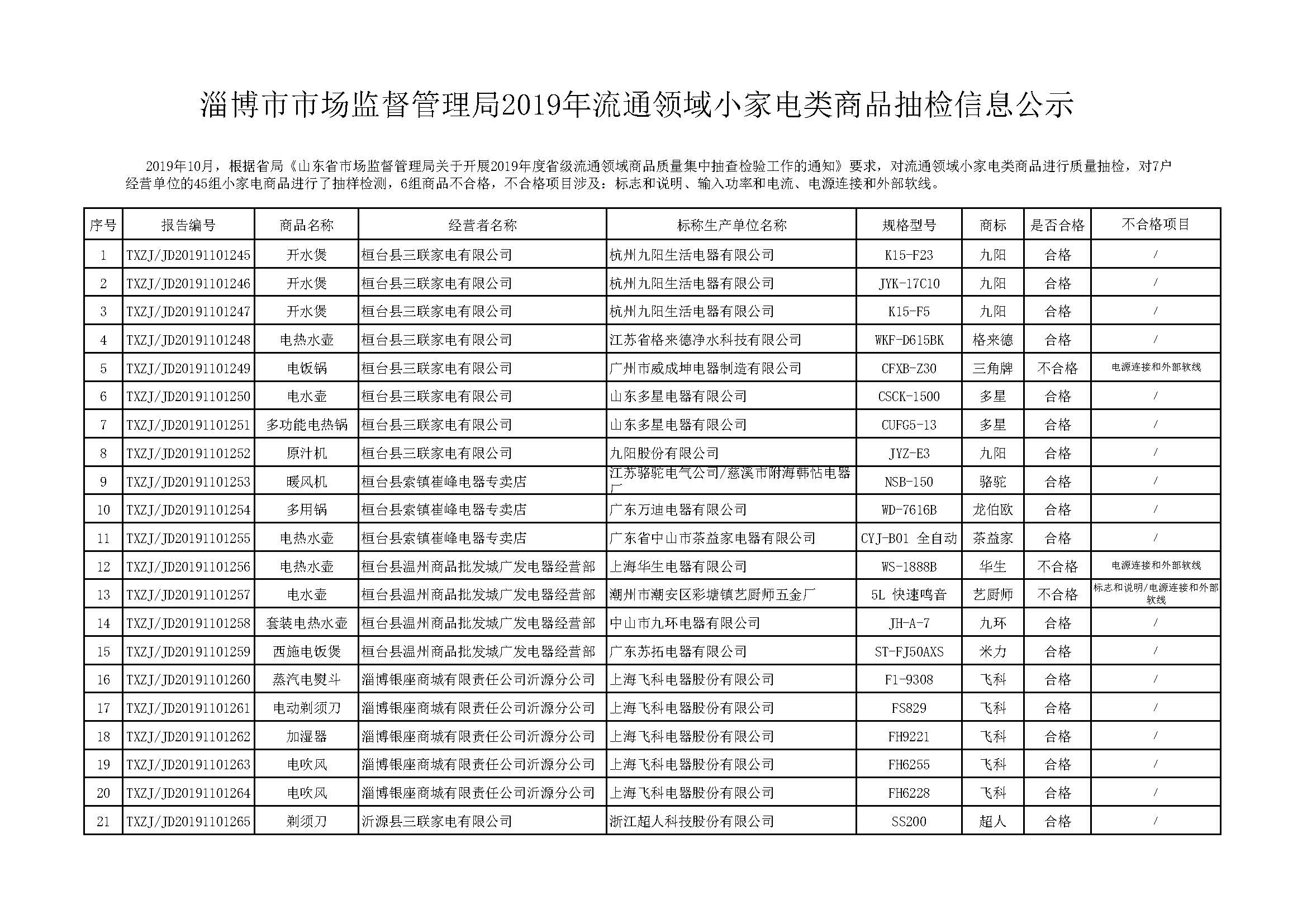 2020年1月17日,淄博市市场监督管理局官网发布2019年流通领域小家电类商品抽检信息。2019年10月,根据省局《山东省市场监督管理局关于开展2019年度省级流通领域商品质量集中抽查检验工作的通知》要求,对流通领域小家电类商品进行质量抽检,对7户经营单位的45组小家电商品进行了抽样检测,6组商品不合格,不合格项目涉及:标志和说明、输入功率和电流、电源连接和外部软线。