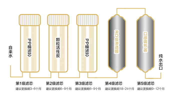 净水系统之所以可以为我们提供更高质量的饮用水,是因为它采用了多重过滤的材料,要让经过处理后的水可以直接饮用,这就要求我们在选购时注重过滤材质和过滤的效率。目前市面上的材料有PP棉(聚丙烯熔喷滤芯)、活性炭、过滤隔膜(根据隔膜孔径不同分为超滤膜、纳滤膜和RO膜)。