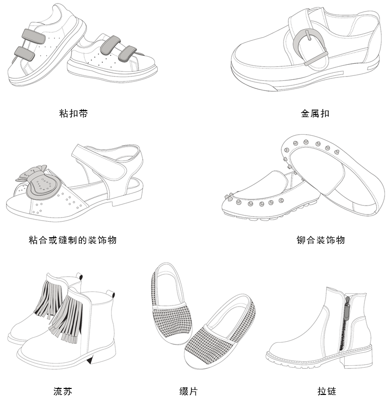 2、查附件。在选购婴幼儿鞋时,应尽量选择鞋面干净清爽,无过多小附件的商品。如果鞋面有小附件,稍微用力拉扯一下检查是否容易松脱,若小附件比一元硬币小且有脱落的风险,不要为婴幼儿选购。婴幼儿鞋中常见的小附件如下所示: