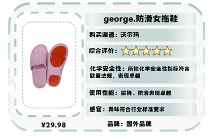 根据国务院办公厅印发《消费品标准和质量提升规划(2016-2020年)》(国办发[2016]68号)“建立企标领跑者制度,引导消费者更多选择标准领跑者产品”的要求。为营造“生产看领跑,消费选领跑 ”的氛围,根据比较试验相关规则评选出9款符合本次比较试验制定的更多更严标准要求品质领跑的塑料拖鞋,分别是:科柔家居防滑男拖鞋、鞋博士防滑居家男拖、网易严选抓地防滑男女家居拖鞋、宝人情侣低跟一字拖、朴西简约日式家居浴室男士拖鞋、南极人居家拖鞋、george.防滑女拖鞋、miniso简约条纹舒适底女士浴室拖、卡骆驰休闲拖凉鞋。其中,国产品牌为6款,科柔、鞋博士为深圳品牌。