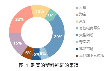1.网购是消费者购买塑料拖鞋的第一途径,占比高达53%。其次是在大型商超购买,占比29%。