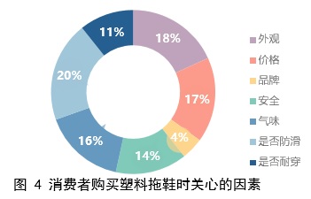 4. 防滑是消费者购买塑料拖鞋时最关心的因素,其次为外观、价格、是否耐穿、气味及安全等,其对品牌敏感度并不太高。