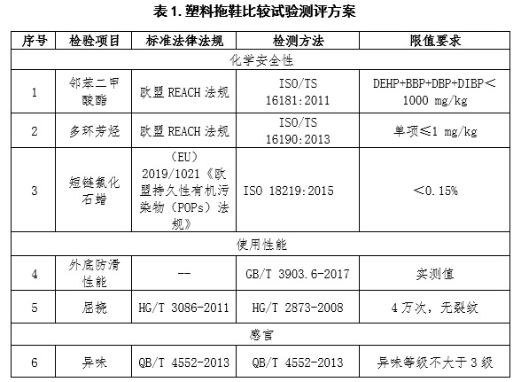 经过与业内专家和检测机构沟通讨论,并通过召开业界意见征求会后确定了本次比较试验检测项目,本次比较试验依据的标准主要有HG/T 3086-2011《橡塑凉、拖鞋》、QB/T 4552-2013《拖鞋》、欧盟REACH法规、(EU)2019/1021《欧盟持久性有机污染物(POPs)法规》。共涉及化学安全性能、使用性能、感官等,详细的项目和要求见表1。
