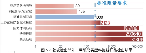 检出值最高为淘宝电商平台集美日用家居商城购买的一款累计评论上百万的拖鞋样品,被检出含量是标准限量要求的313倍。