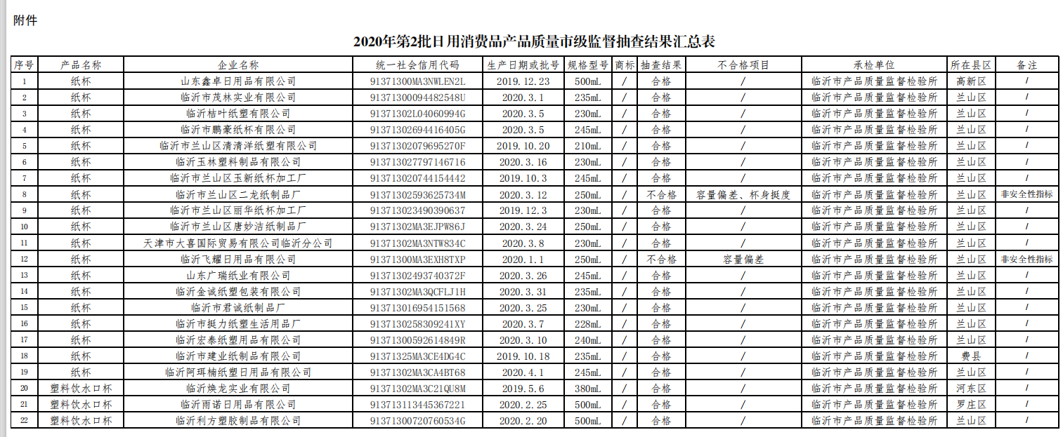 近日,山东临沂市市场监督管理局发布通告称,2020年第2批,临沂市市场监督管理局组织开展了日用消费品产品质量市级监督抽查。本次共抽查了全市生产领域22家企业22批次日用消费品产品。