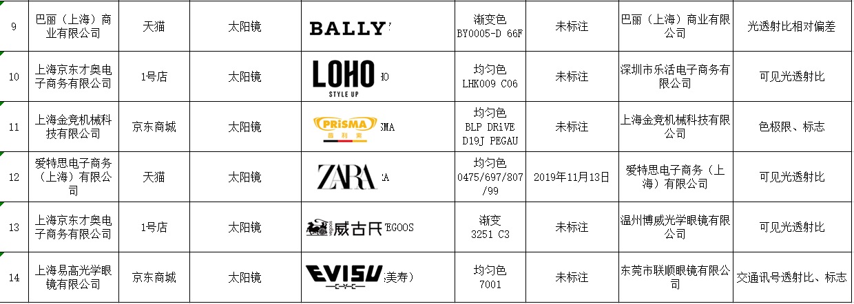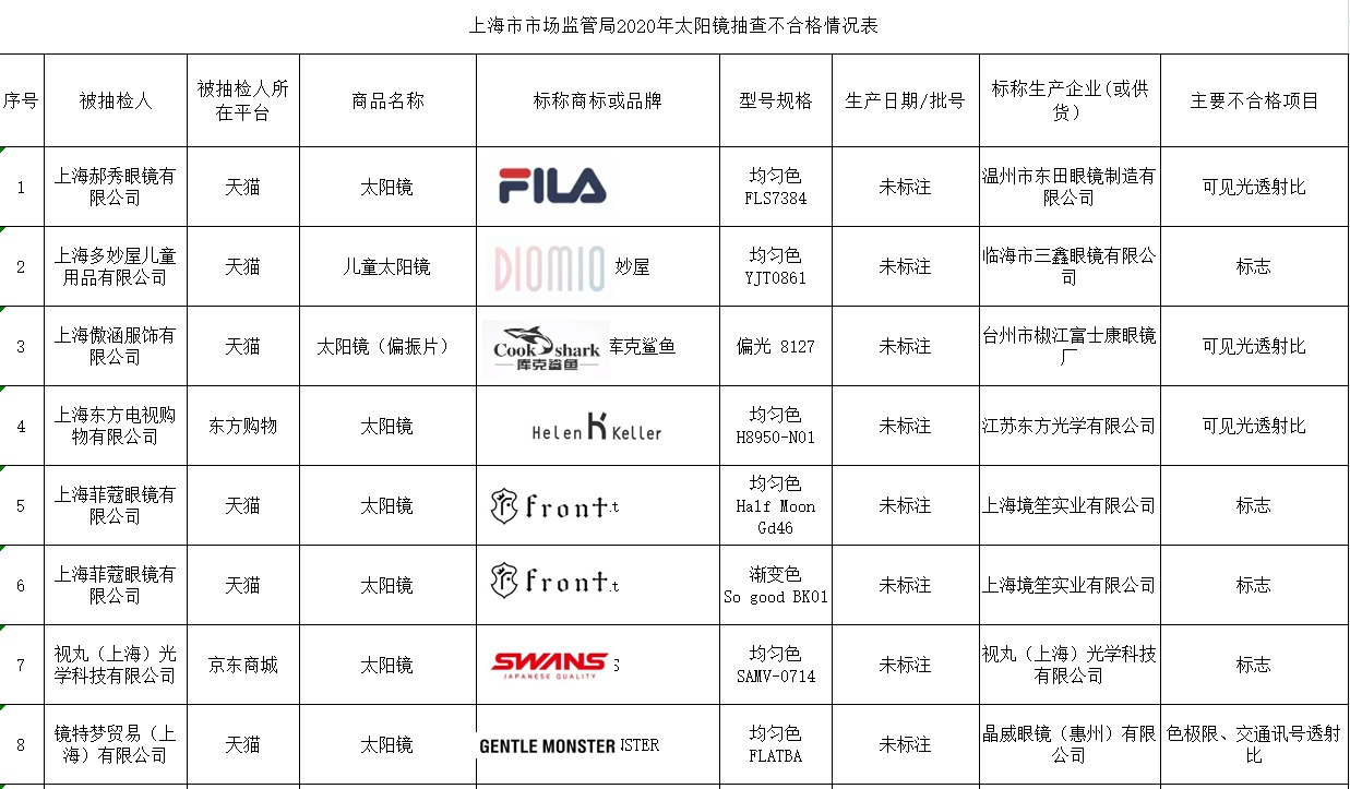 上海市市场监督管理局:14批次太阳镜抽查不合格