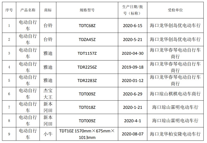 海南省市场监督管理局:2批次电动自行车产品不合格