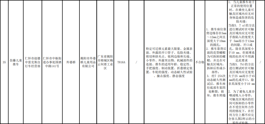 据公告,本次共对20家销售者销售的35批次童车产品质量开展了监督抽查,涉及贵州省贵阳市、遵义市、安顺市、铜仁市、毕节市、六盘水市、黔东南州、黔西南州、黔南州9个市(州)。本次监督抽查依据GB 14746-2006《儿童自行车安全要求》、GB 14747-2006 《儿童三轮车安全要求》、GB 14748-2006《儿童推车安全要求》、GB 14749-2006《婴儿学步车安全要求》等标准要求进行检验。经检验,发现8家销售者销售的9批次产品不合格,不合格指标为稳定性、动态耐久性、车轮强度、座位、危险夹缝、小零件、危险夹缝及孔、开口、静态强度,不合格发现率为25.71%。具体抽查结果见附件。