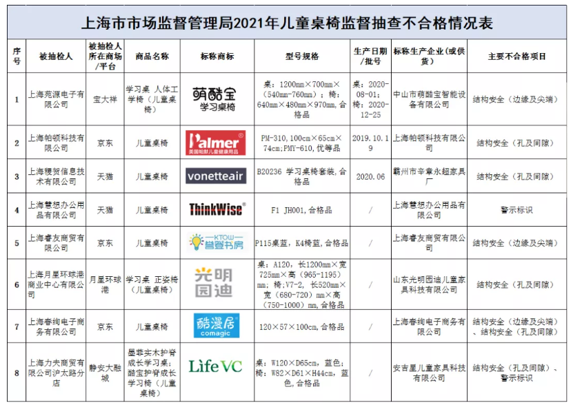 中国质量新闻网讯 针对消费者投诉、举报集中及质量问题较多的产品,近期,上海市市场监管局集中执法力量对黄浦、静安、普陀等7个区域11家企业和天猫商城、京东商城2个网络交易平台销售的儿童桌椅进行了监督抽查。