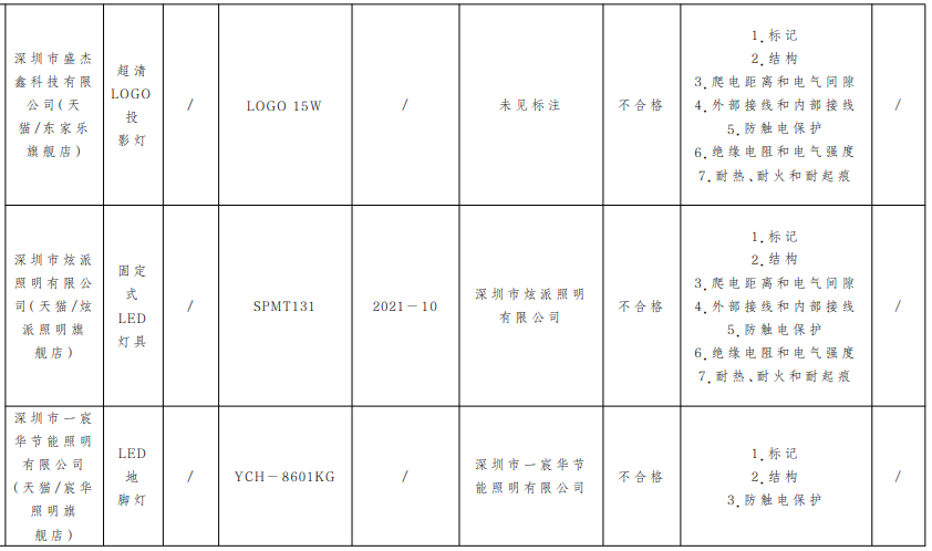 近日,深圳市市场监管局发布2021年个护健康器具等11类产品质量监督抽查结果。本次抽查了深圳市71家受检单位生产、销售的117批次灯及灯具产品,发现不合格产品28批次。其中,生产领域抽查了32家企业的54批次产品,发现不合格产品3批次;流通领域(实体店)抽查了12家企业的27批次产品,未发现不合格产品;流通领域(网络交易平台)抽查了27家企业的36批次产品,发现不合格产品25批次。