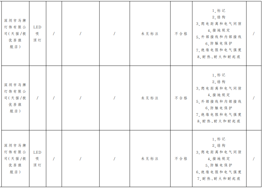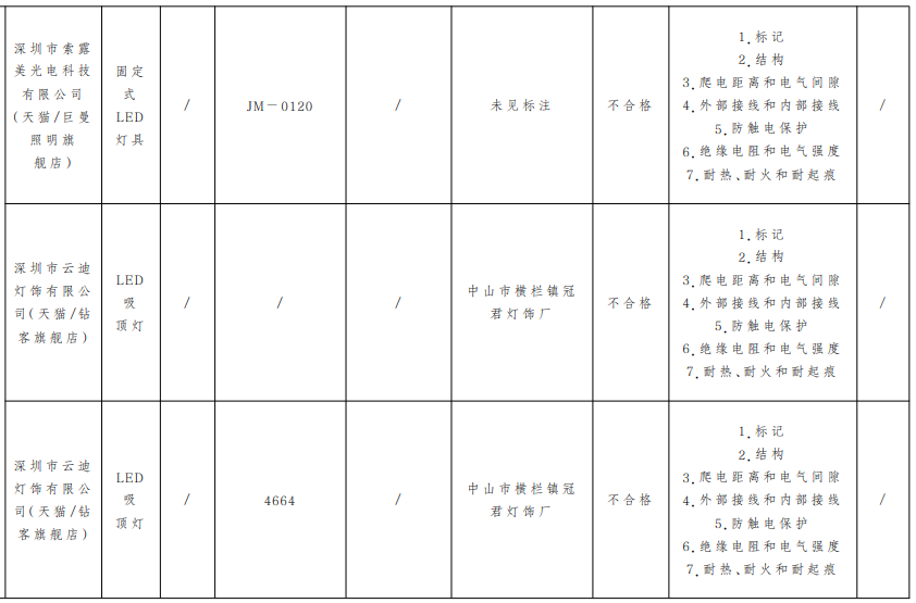 本次抽查依据GB7000.1-2015《灯具第1部分:一般要求与试验》等标准的要求,重点对固定式通用灯具、嵌入式灯具、可移式通用灯具、电源插座安装的夜灯的标记,结构,爬电距离和电气间隙,接地规定,外部接线和内部接线,防触电保护,防尘、防固体异物和防水,绝缘电阻和电气强度,耐热、耐火和耐起痕等9个项目进行了检测,不合格项目有:标记,结构,防触电保护,耐热、耐火和耐起痕,接地规定,外部接线和内部接线,爬电距离和电气间隙,绝缘电阻和电气强度;对普通照明用50V以上自镇流LED灯的标志,互换性,意外接触带电部件的防护,潮湿处理后的绝缘电阻和介电强度,机械强度,灯头温升,耐热性,防火与防燃,故障状态等9个项目进行了检测,无不合格项目;对LED模块用直流或交流电子控制装置的标志,防止意外接触带电部件的措施,保护接地装置,防潮和绝缘,介电强度,异常状态,结构,爬电距离和电气间隙,耐热防火及漏电起痕等9个项目进行了检测,无不合格项目。