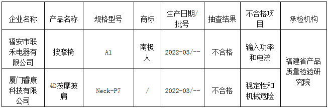 不合格产品涉及南极人按摩椅(福安市联禾电器有限公司)、4D按摩披肩(厦门睿康科技有限公司)。
