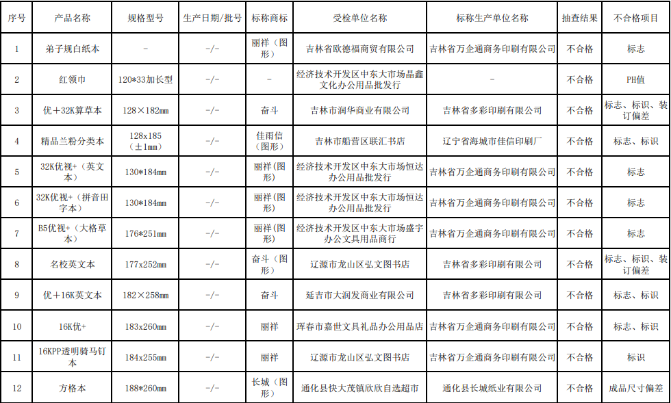 不合格产品标称生产单位涉及,吉林省万企通商务印刷有限公司、吉林省多彩印刷有限公司、辽宁省海城市佳信印刷厂、通化县长城纸业有限公司、汕头市澄海区乐吧玩具厂、广东得培力文创科技有限公司、长春市丽祥文化用品印务有限公司、江苏长江纸业有限公司、平乡县圣杰童车厂、上海小吉鸭文具有限公司台州分公司、安硕文教用品(上海)股份有限公司、上海妙德文具有限公司、佛山市智慧创意文具有限公司等。