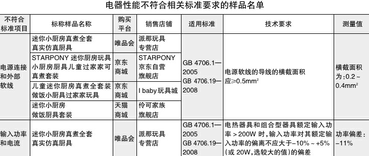 电器性能关乎儿童厨房“真煮”厨具的使用体验和使用安全,是衡量其是否符合质量安全要求的重要指标。本次测试发现,部分儿童厨房“真煮”厨具不符合GB 4706.1—2005《家用和类似用途电器的安全第1部分:通用要求》和GB 4706.19—2008《家用和类似用途电器的安全液体加热器的特殊要求》标准相关要求,其中,电源连接线和外部软线不符合标准要求4款、输入功率和电流项目不符合标准要求1款。