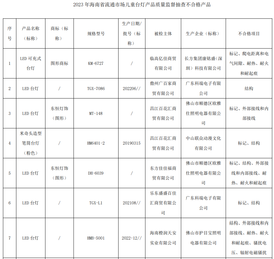 海南省市场监督管理局公布2023年流通市场儿童台灯产品质量监督抽查结果 ,不合格率为75%
