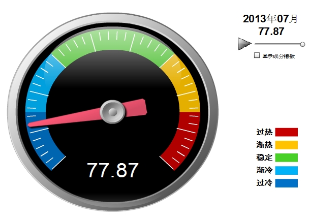 2013年7月中轻电池景气指数为77.87,继续停留在“过冷”提示区,较3月的68.56有较大提升。(参见图1)