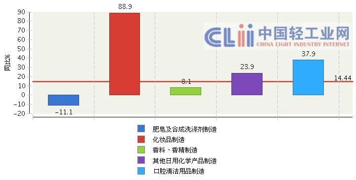 日化行业的4个子行业中,化妆品制造的利润增速达到了88.9%,口腔清洁用品制造也实现了37.9%的增长,香精香料增速略低于日化行业平均增速,而肥皂及合成洗涤剂制盈利水平下降,比去年同期下降11.1%。