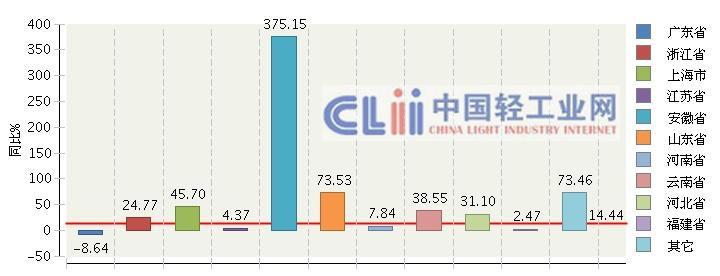 从各省市完成利润额增速来看,安徽省增速达到375.15%,山东省也实现73.53%的高速增长。广东省虽然完成利润额最多,但较去年同期下降了8.64%。