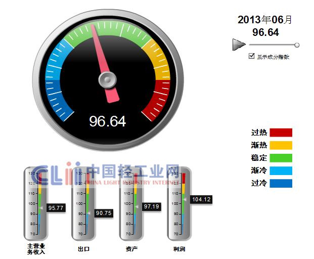 据中国轻工业经济运行及预测预警系统显示,2013年上半年,我国日化行业景气指数在稳定区间中下部波动,4月开始出现下降趋势,6月本行业景气指数为96.64,6月各分项指数中,主营业务收入指数为95.77,出口指数为90.75,资产指数为97.19,利润指数为104.12。
