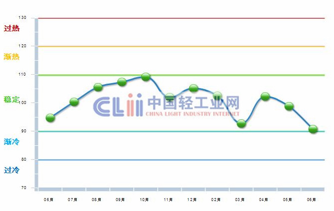 日化行业出口指数波动明显,3月跌至稳定区间底部,4月出现回升后,5、6两月又呈现明显下降态势,6月该指数跌至稳定区间底部至90.75。