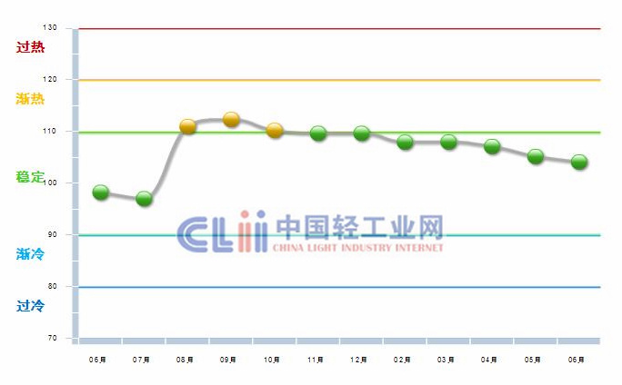 日化行业利润指数上半年呈现持续下降态势,有去年年底的渐热区间跌至稳定区间,6月份该指数为104.12。