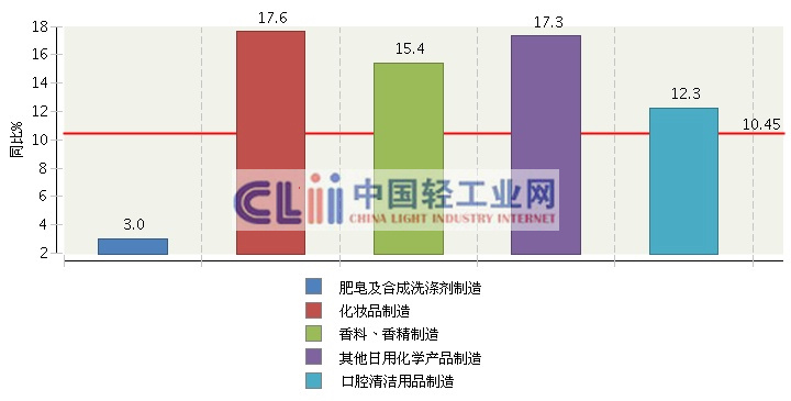 从各子行业看,2013年1-6月肥皂及合成洗涤剂制造完成累计主营业务收入同比增长3.01%;化妆品制造完成累计主营业务收入同比增长17.64%;香料、香精制造完成累计主营业务收入同比增长15.42%;口腔清洁用品制造完成累计主营业务收入同比增长12.26%。