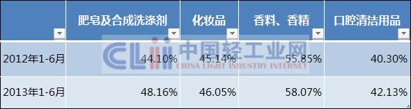 从2013年上半年与2012年上半年数据对比看,肥皂及合成洗涤剂、化妆品、香料香精、口腔清洁用品四大子行业内资企业主营业务收入占比都有不同程度扩大。